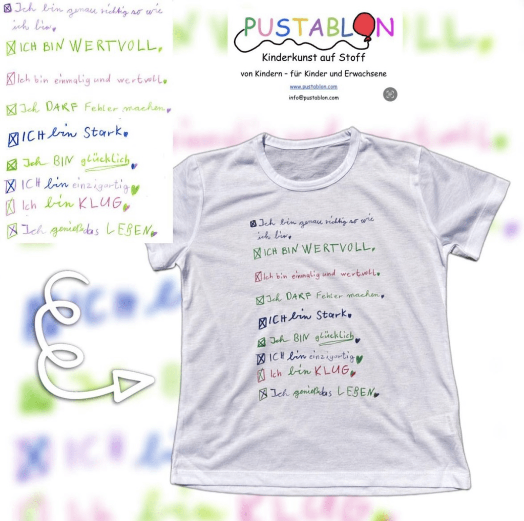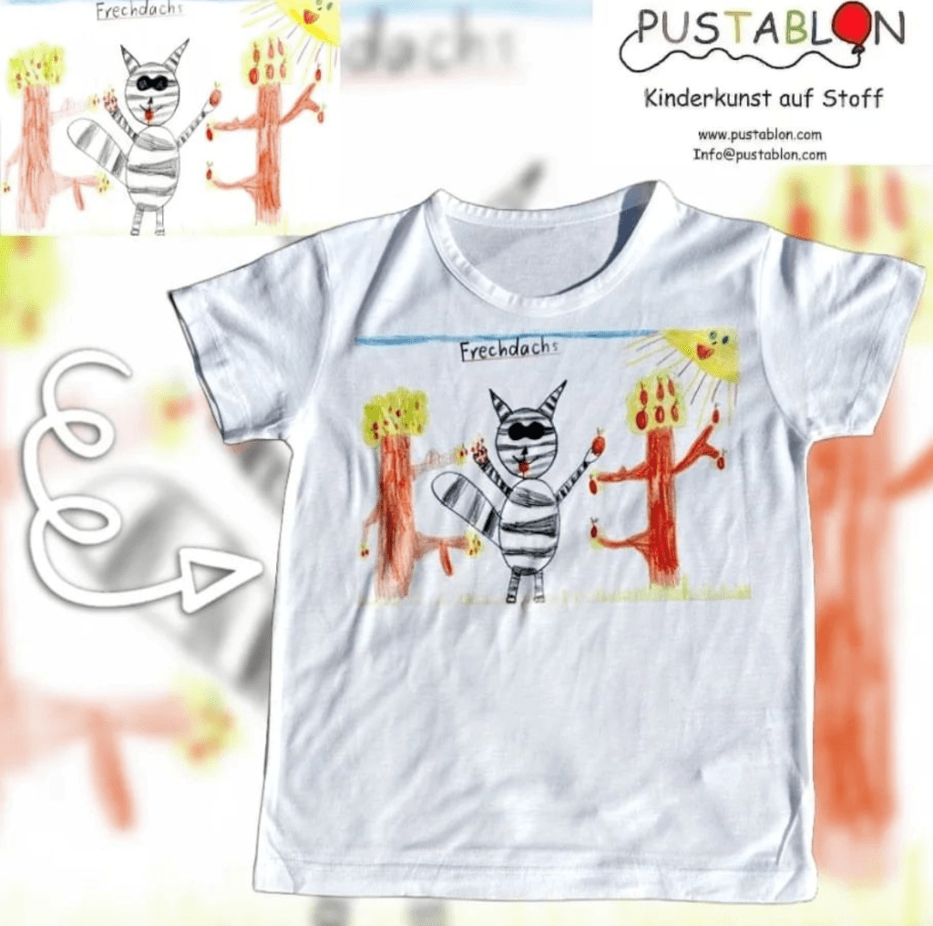 Dank des Sublimations- oder DTF Druckverfahrens kann jedes Kunstwerk originalgetreu auf Textilien, Tassen, Trinkflaschen, Frühstücksbrettchen, Untersetzer und vieles mehr übertragen, um wundervolle und einzigartige Geschenke zu kreieren. Um die bestmögliche Qualität zu gewährleisten, scanne die Zeichnung ein und schicke es an info@pustablon.com.